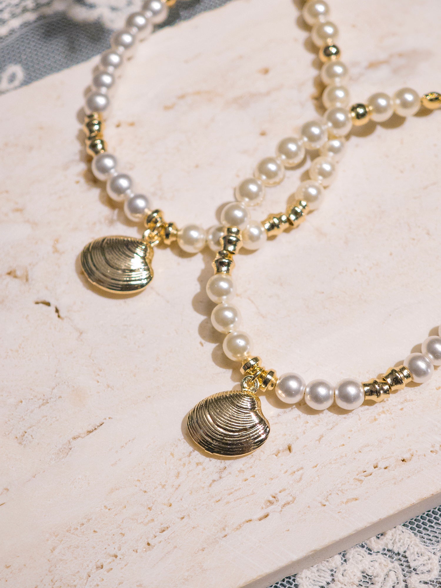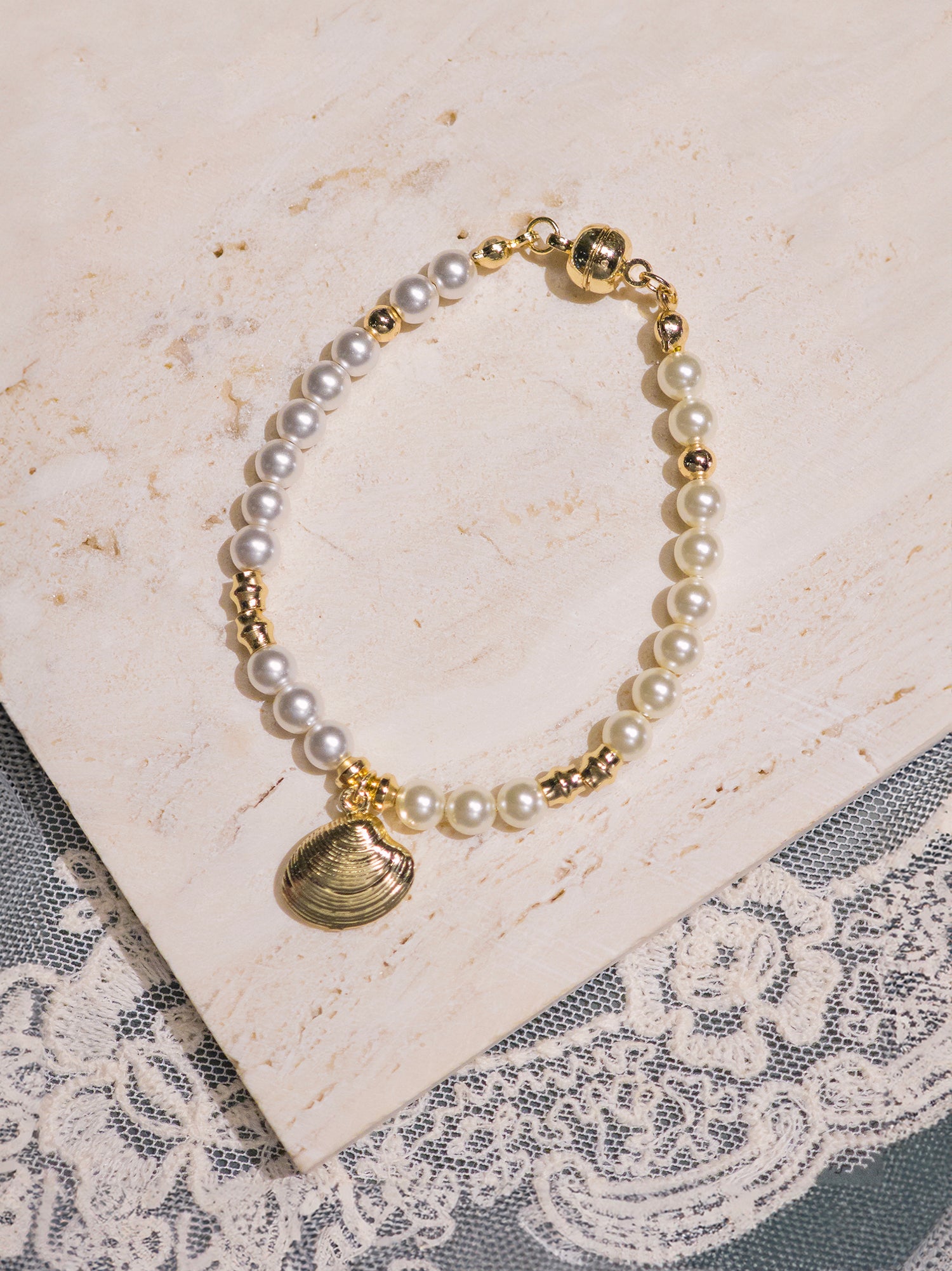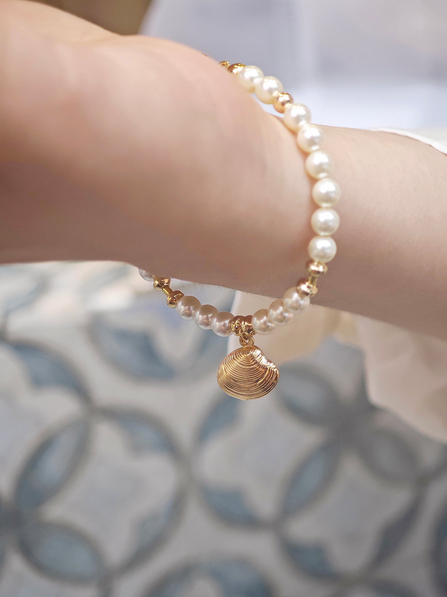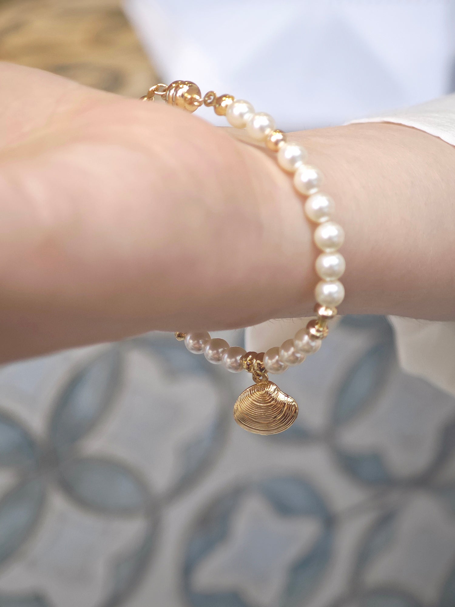 This delicate bracelet features 5 mm warm white Swarovski pearls nestled along a 14K gold-plated seashell-inspired chain, evoking the soft shimmer and textures of sand and sea. Lightweight and versatile, it wraps gently around the wrist, adding a subtle radiance to daily outfits or layered looks.