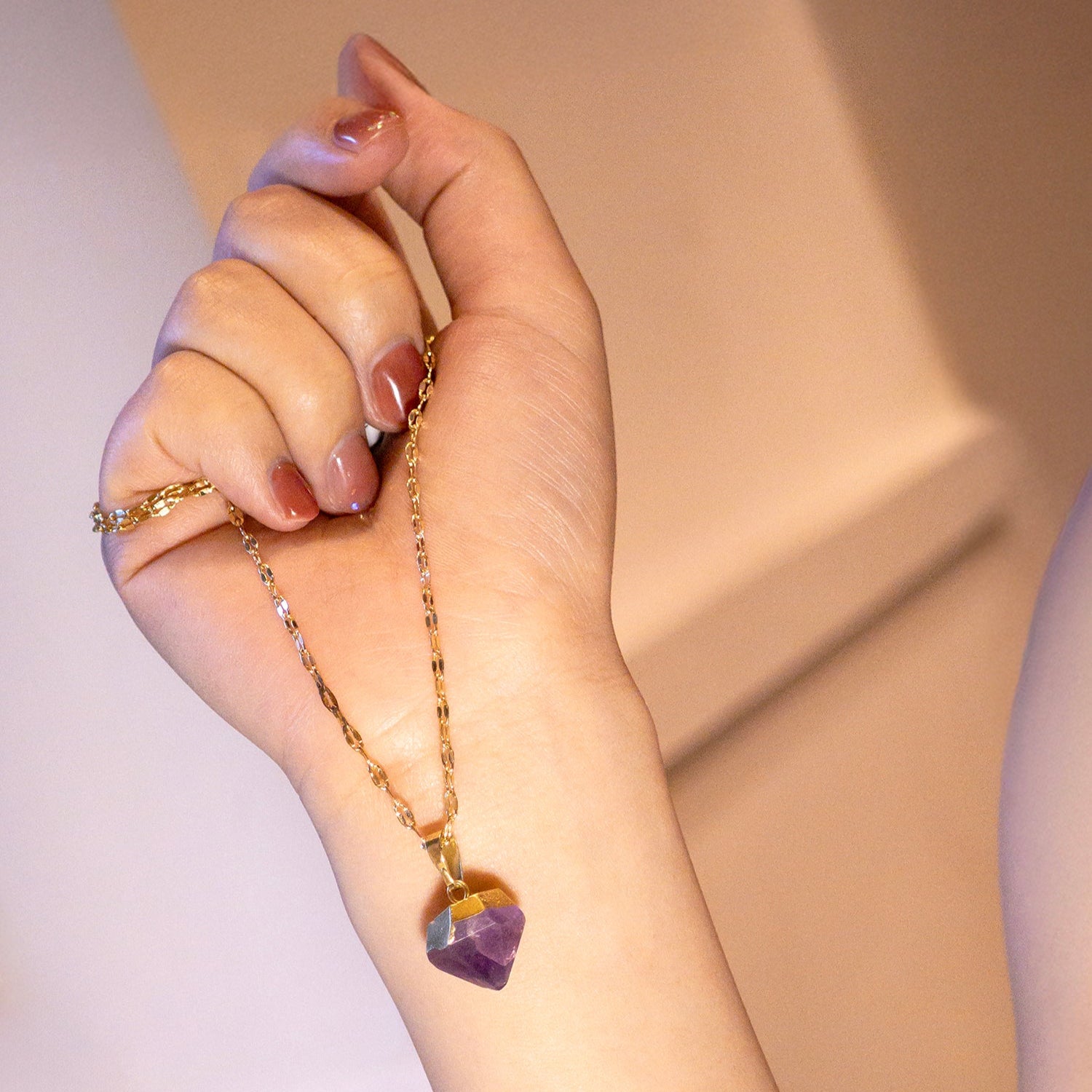 Natural Amethyst Necklace features a raw cone-shaped amethyst pendant that highlights the crystal’s unique beauty and spiritual charm. Paired with a delicate 14K gold-plated chain, this necklace brings out the deep purple tones of the stone, making it a timeless accessory for daily wear.